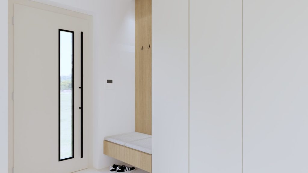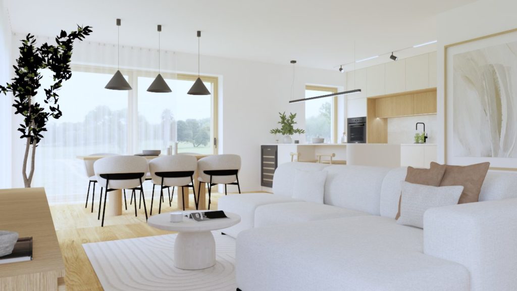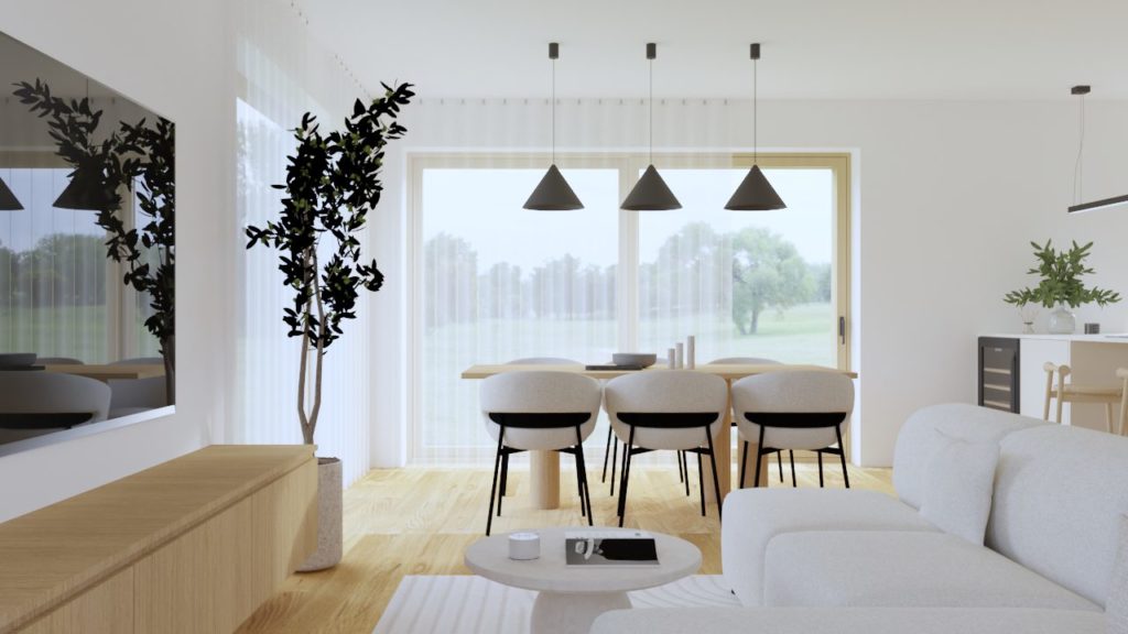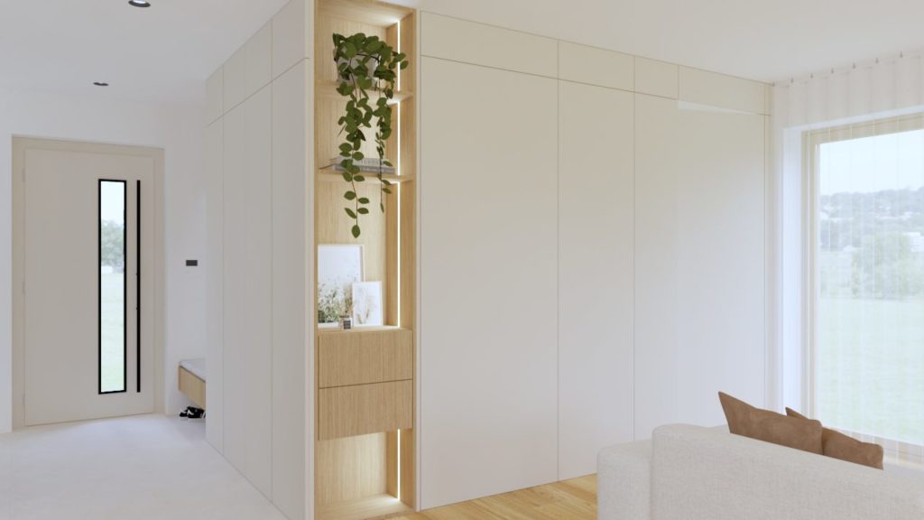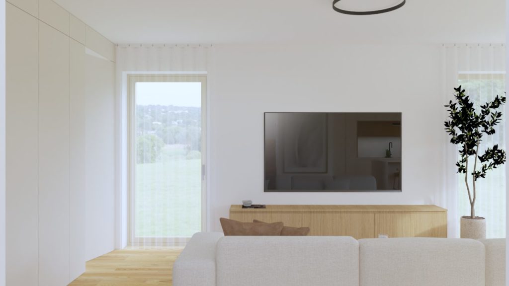 Osrednji bivalni prostor je zasnovan odprto in povezano, z jasnim poudarkom na vsakodnevni funkcionalnosti. Posebnost zasnove je diskretno umeščena, skrita pisarna, ki se odpira iz dnevne sobe in omogoča umirjeno delo brez vizualnega posega v bivalni del.