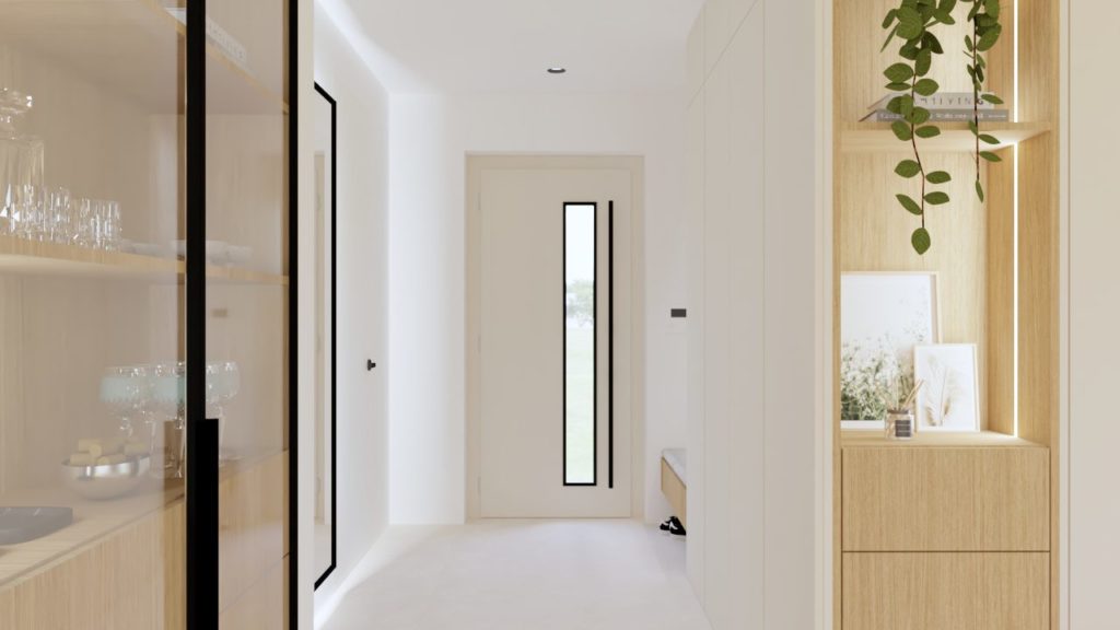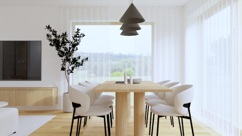 Celoten interier odraža sodoben, a brezčasen pristop k oblikovanju — dom, ki s premišljeno izbiro materialov, jasno zasnovo in občutkom za detajl ponuja kakovostno bivanje v sožitju z naravo.
