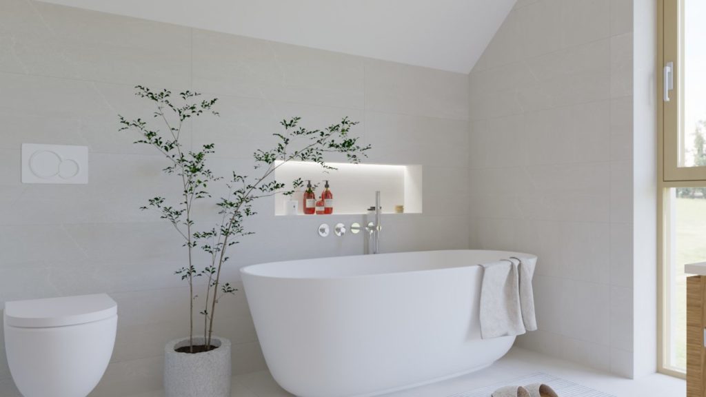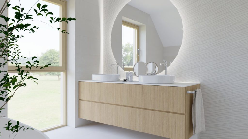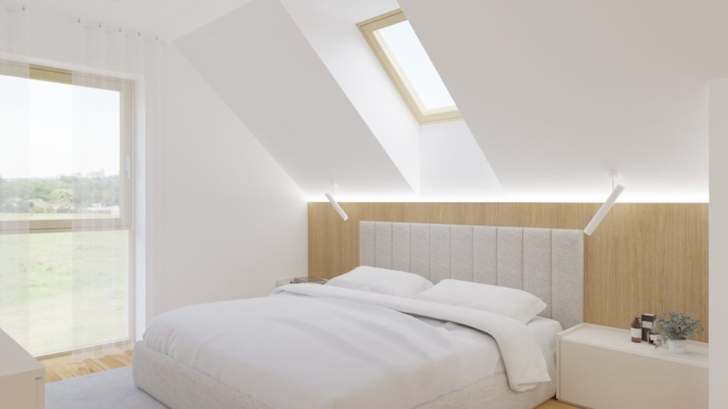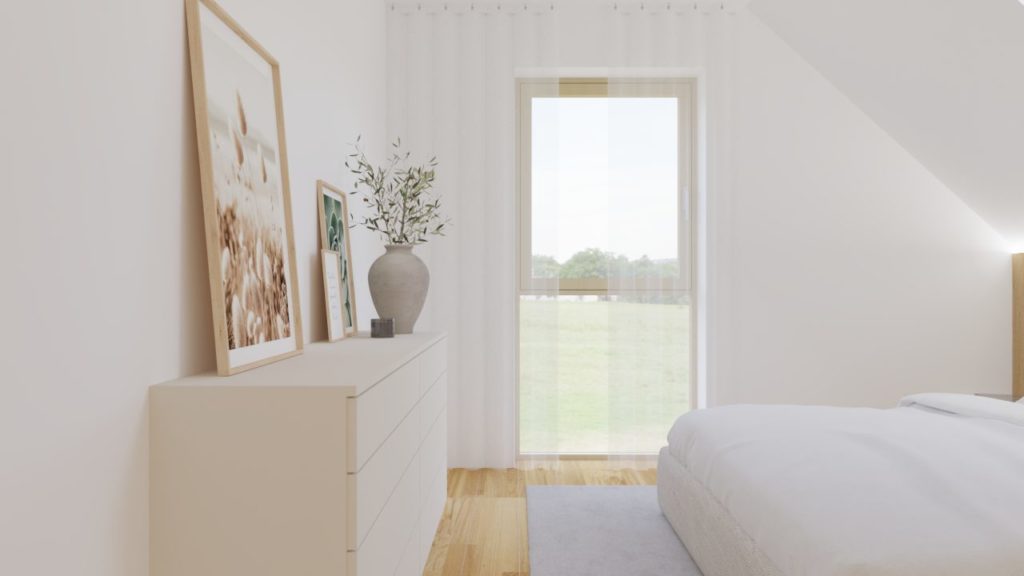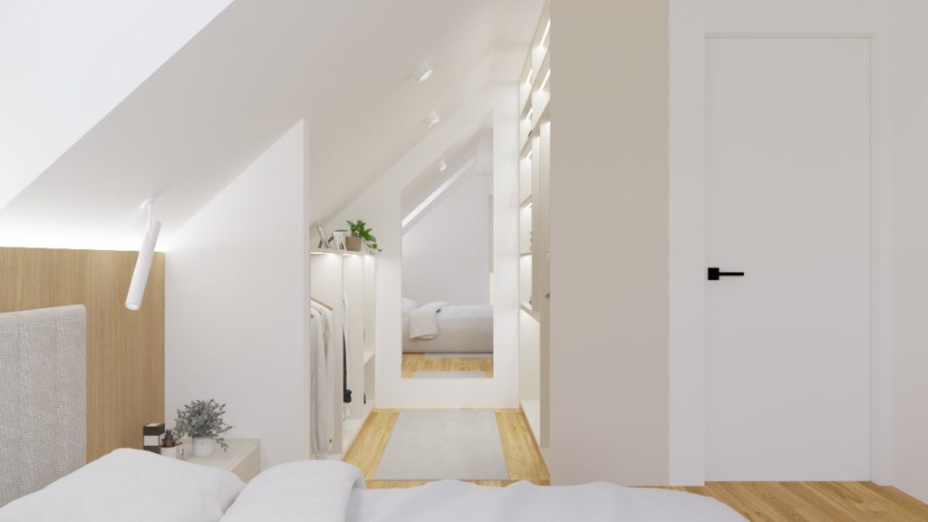 Kopalnica sledi nežnejši interpretaciji materialov – z uporabo subtilne keramike v svetlih, toplih tonih, ki prostoru daje občutek čistosti in sproščenosti. Spalnica z odprto garderobno sobo deluje kot intimno zatočišče, kjer se leseni poudarki in umirjena barvna paleta združijo v prijetno, pomirjujoče okolje.