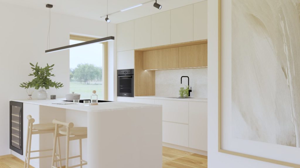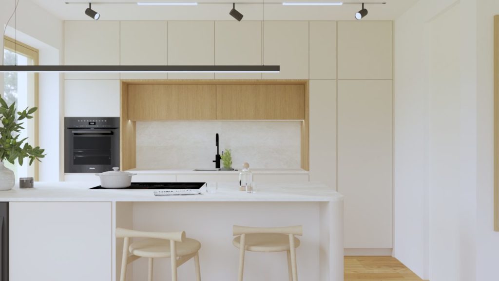 Kuhinja združuje estetiko in vzdržljivost, s pultom iz tehničnega kamna Dekton, ki s svojo prefinjeno površino dopolnjuje naravno materialno zgodbo prostora. Kuhinja je zasnovana kot srce doma, prilagojeno družinskemu ritmu in druženju.