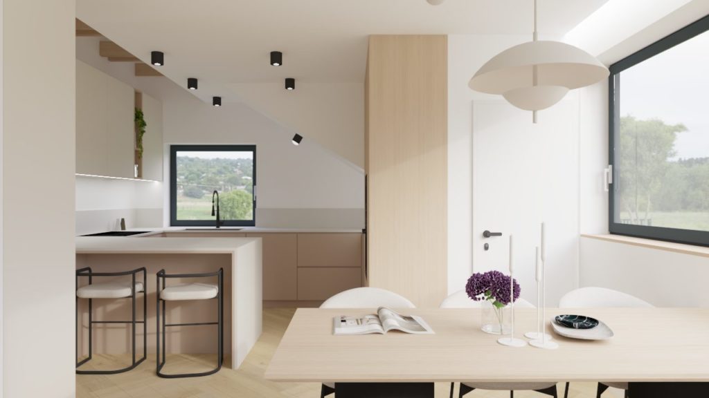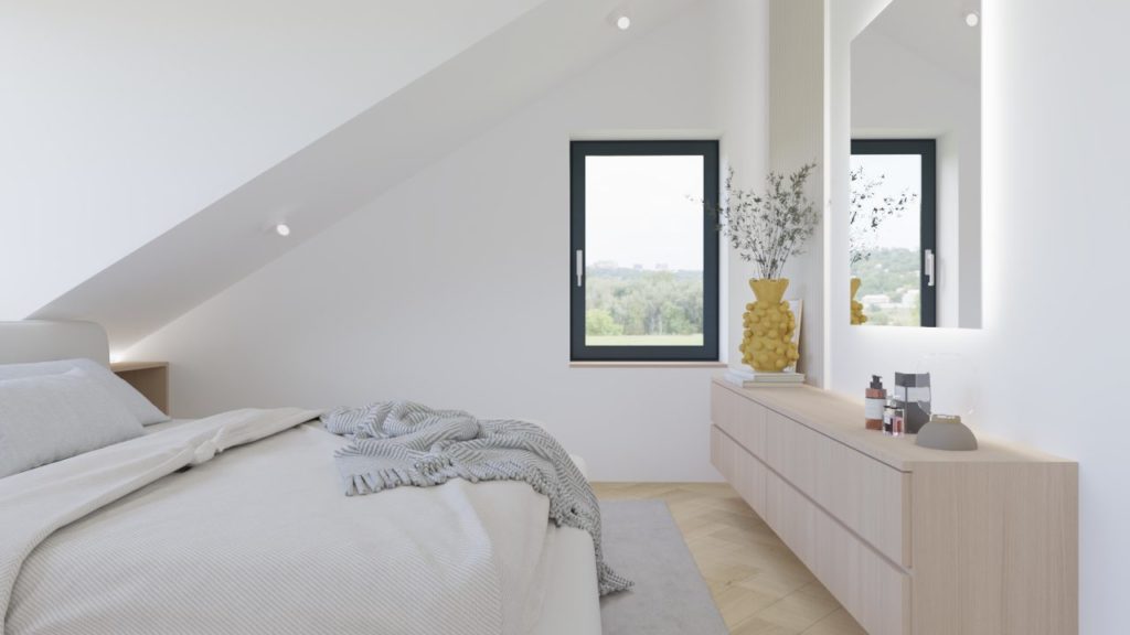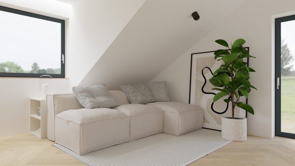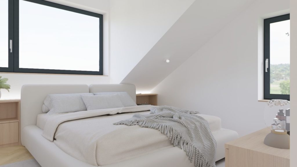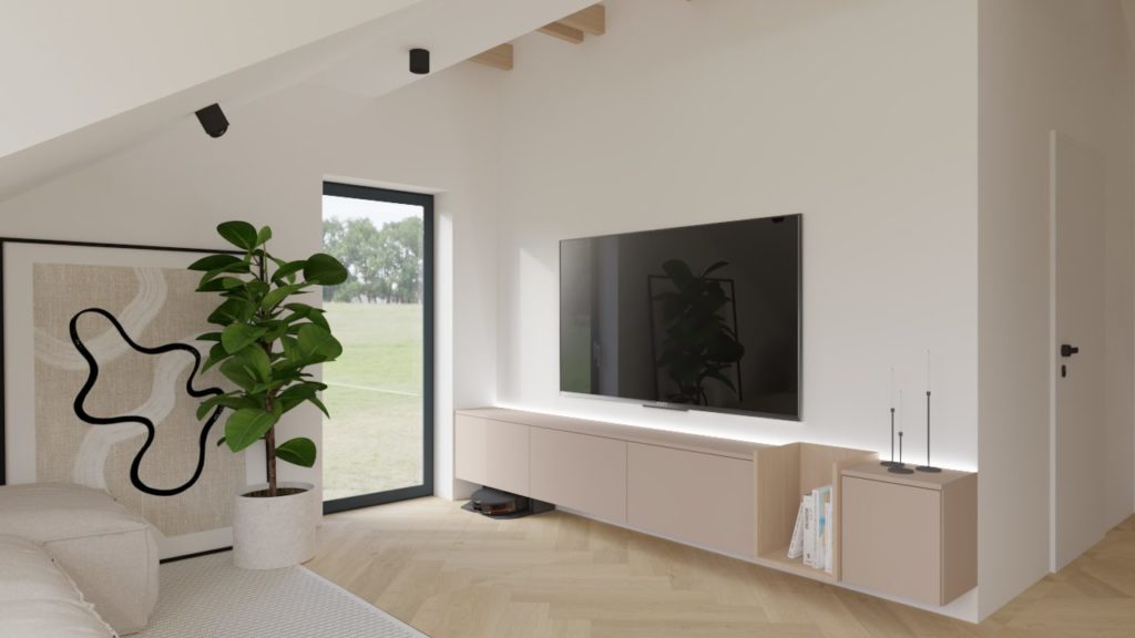 Celoten interier deluje umirjeno, naravno in toplo — mansardni dom, ki s preprostimi materiali, dobro svetlobo in premišljeno zasnovo ponuja kakovostno bivanje ter občutek pravega doma.