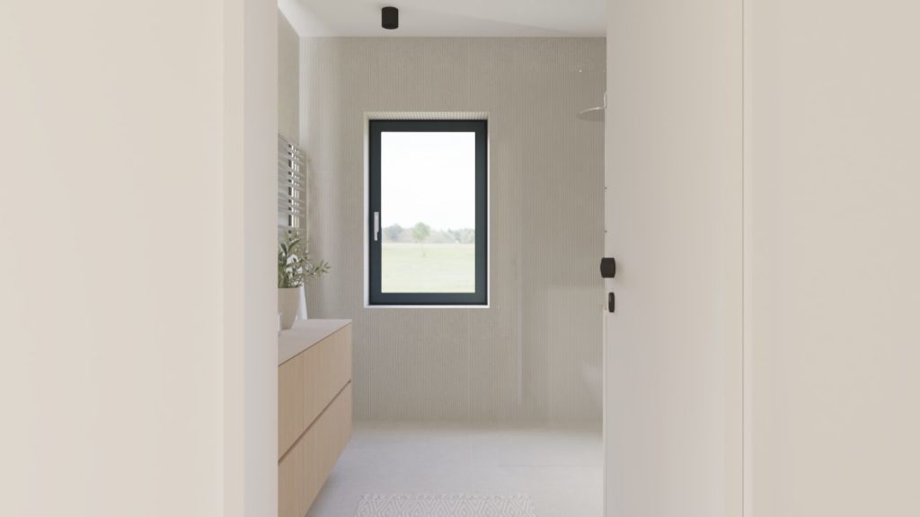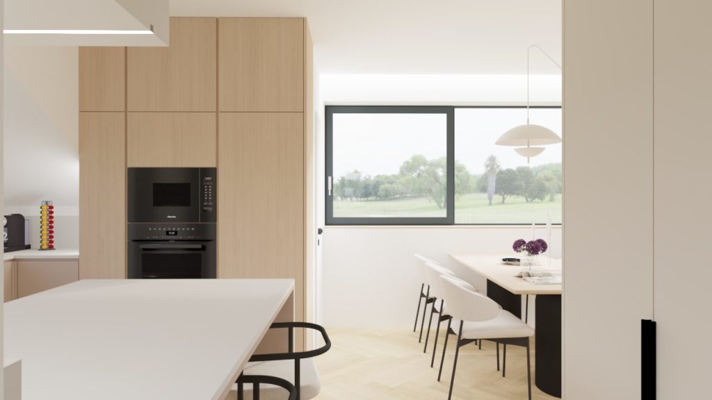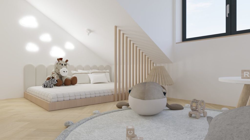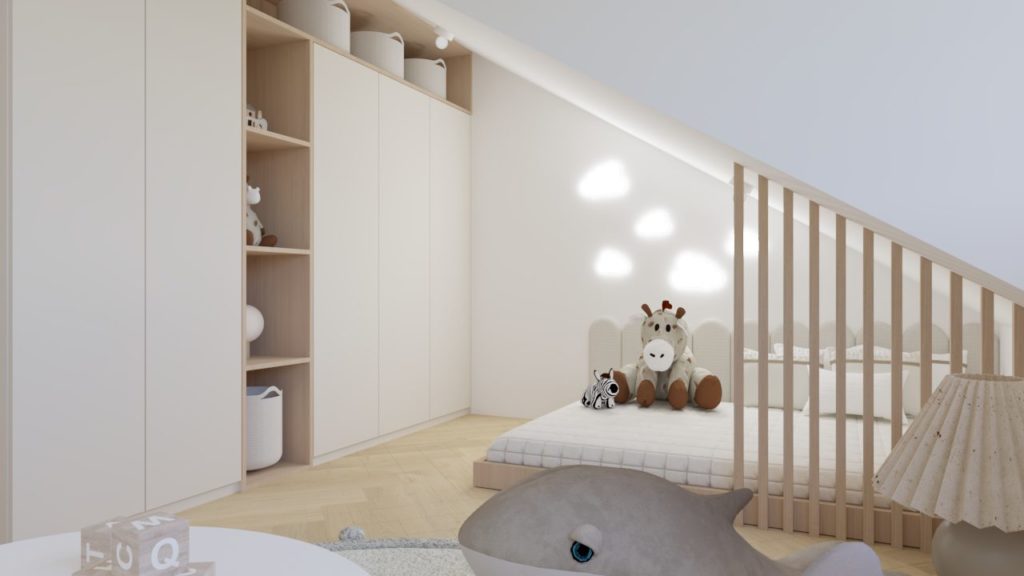 Bivalni del je zasnovan odprto in povezano, z jasnim poudarkom na udobju in vsakdanji funkcionalnosti. Otroška sobica je premišljeno umeščena kot svetel, prijeten prostor, ki omogoča rast in prilagajanje različnim življenjskim obdobjem.