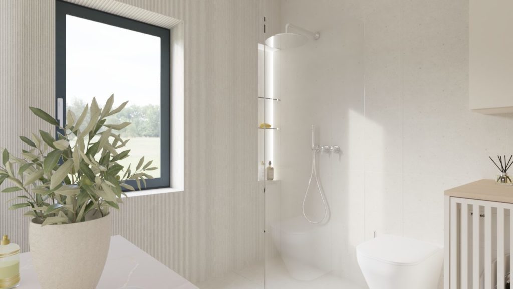 Mansardni naklon strehe prostoru daje poseben značaj in omogoča obilico naravne svetlobe, ki mehča linije in poudarja toplino izbranih materialov. Barvna paleta temelji na toplih, zemeljskih tonih, ki ustvarjajo občutek varnosti in miru, hkrati pa ohranjajo svetlost in lahkotnost interierja.