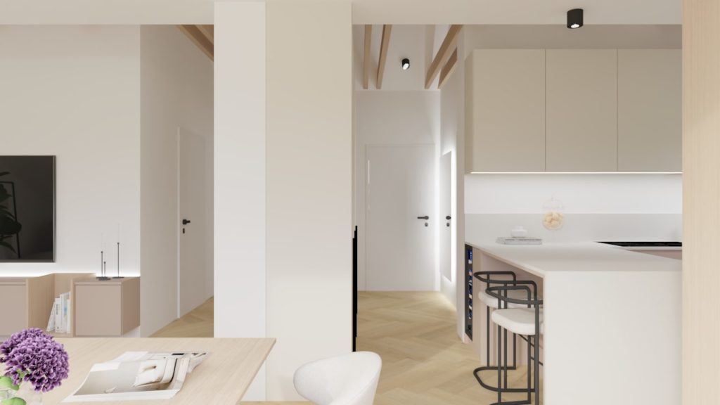 Rdeča nit stanovanja je subtilen hrastov vinil v vzorcu ribje kosti, ki prostoru doda eleganco, ritem in brezčasnost. Njegova nežna tekstura povezuje vse prostore v skladno celoto ter lepo dopolnjuje naravne barve sten in pohištva.